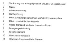 - A device for storing and releasing energy using lithium-ion accumulators with a battery management system, an inverter for current inversion, and a separate mobile transport and storage unit, decoupling the weight of the energy storage from the tool, enabling flexible and prolonged power supply without noise or emissions.