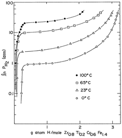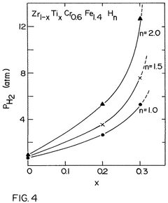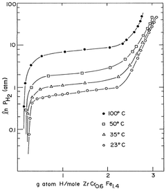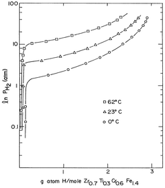- Alloys composed of zirconium, chromium, and optionally titanium, with a C14 hexagonal crystal structure and ZrCr2 stoichiometry, where zirconium is partially replaced by titanium and chromium by iron, maintaining the AB2 stoichiometry, enhancing hydrogen vapor pressure and absorption/desorption characteristics.