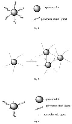 Quantum dots are engineered for biomedical applications including imaging, diagnostics, and therapeutic delivery. Their unique optical properties, such as high brightness and photostability, make them excellent fluorescent labels. Surface functionalization enables targeting specific biological structures while maintaining biocompatibility. These materials are also developed for sensing applications where their optical properties change in response to specific analytes or environmental conditions.Expand Specific Solutions05 Quantum dot integration in electronic and optoelectronic devices