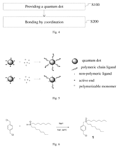 - Quantum dots for display applications: Quantum dot materials specifically designed for display technologies are described. These materials enable enhanced color gamut, brightness, and energy efficiency in displays through their narrow emission spectra and high quantum yields. The formulations include quantum dots optimized for color conversion layers, backlight units, and direct emissive displays. Various encapsulation methods are also detailed to protect quantum dots from environmental degradation while maintaining their optical properties in display applications.