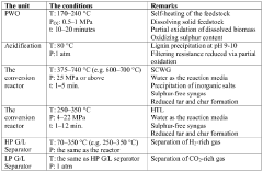 - A two-step process involving partial wet oxidation followed by supercritical water gasification or hydrothermal liquefaction, allowing for efficient separation of sulphurous compounds and salts, reducing energy consumption, and producing a broader range of valuable products like bio-oil and syngas.