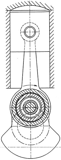 - The design shifts the point of force application outward by transmitting driving force from bearing journals on the connecting rods to bearing eyes on the crankshaft, utilizing hollow pins and additional bearing parts to increase the lever effect without compromising speed, and incorporates asymmetrical and toothed components for enhanced power transmission and force absorption.