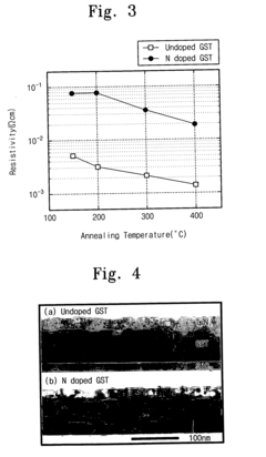 - Incorporating nitrogen atoms into the phase-changeable material, such as Ge--Sb--Te--N, to increase resistivity and reduce grain size, resulting in a polycrystalline structure with grains less than 100 nm, which reduces the current pulse required for state changes and enhances thermal stability.