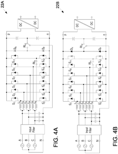 The integration of LLC resonant converters with totem-pole PFC stages creates a highly efficient DC-DC conversion system for on-board chargers. This combination leverages soft-switching techniques to minimize switching losses and reduce electromagnetic interference. The LLC stage provides galvanic isolation and precise voltage regulation while maintaining high efficiency across wide input voltage ranges, which is crucial for battery charging applications.Expand Specific Solutions03 EMI Mitigation Techniques in Totem-Pole PFC and LLC Topologies