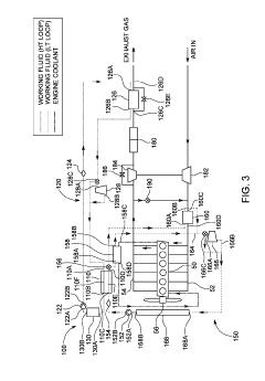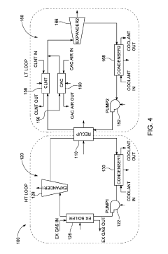 - The implementation of a two-loop ORC Waste Heat Recovery System, comprising a High Temperature (HT) loop and a Low Temperature (LT) loop, interconnected by a recuperator, which allows for separate heat management and the use of different working fluids in each loop to optimize energy capture from various sources of waste heat, including engine coolant, charge air, and exhaust gas recirculation, thereby enhancing overall system efficiency.