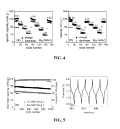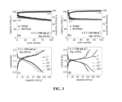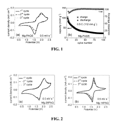- Electrolyte compatibility with organic cathodes: The performance of organic cathode materials in magnesium batteries is significantly influenced by the compatibility with electrolytes. Specialized electrolyte formulations are developed to ensure efficient magnesium ion transport while preventing degradation of the organic cathode materials. Non-nucleophilic electrolytes and those containing specific additives can mitigate side reactions, enhance the reversibility of magnesium deposition/dissolution, and improve the overall electrochemical performance of the battery system.