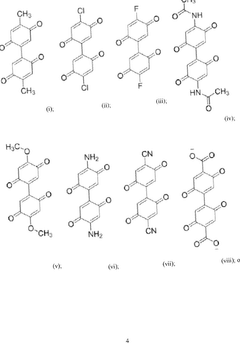 - Quinone-based organic cathode materials: Quinone derivatives are promising organic cathode materials for magnesium batteries due to their high theoretical capacity and redox activity. These compounds contain carbonyl groups that can coordinate with magnesium ions during the charge-discharge process. Various quinone structures, including anthraquinones, benzoquinones, and their derivatives, have been investigated to optimize properties such as solubility, stability, and electron transfer kinetics for improved battery performance.