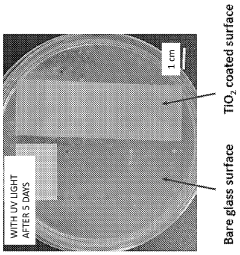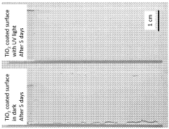 Titanium dioxide (TiO2) is widely used as a photocatalyst in anti-fouling surface applications. When exposed to UV light, TiO2 generates reactive oxygen species that can decompose organic contaminants and kill microorganisms on the surface. These coatings can be applied to various substrates to provide self-cleaning and anti-fouling properties, making them suitable for marine structures, building exteriors, and other surfaces exposed to biological fouling.- TiO2-based photocatalytic coatings for anti-fouling: Titanium dioxide (TiO2) is widely used as a photocatalyst in anti-fouling surface applications. When exposed to UV light, TiO2 generates reactive oxygen species that can decompose organic contaminants and kill microorganisms on the surface. These coatings can be applied to various substrates to provide self-cleaning and anti-fouling properties, making them suitable for marine structures, building exteriors, and other applications where surface cleanliness is important.
