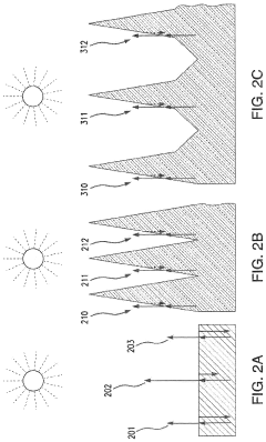 Anti-reflective coatings are applied to photovoltaic glass to minimize light reflection and maximize the amount of solar radiation entering the solar cell. These coatings typically consist of multiple layers with carefully controlled thicknesses and refractive indices. By reducing reflection losses at the air-glass interface, these coatings can significantly improve the overall efficiency of photovoltaic modules. The coatings may be composed of materials such as silicon nitride, titanium dioxide, or silicon dioxide, and are designed to work across the solar spectrum.Expand Specific Solutions03 Self-cleaning and hydrophobic coatings for photovoltaic glass