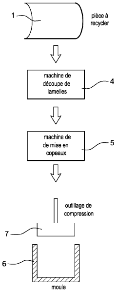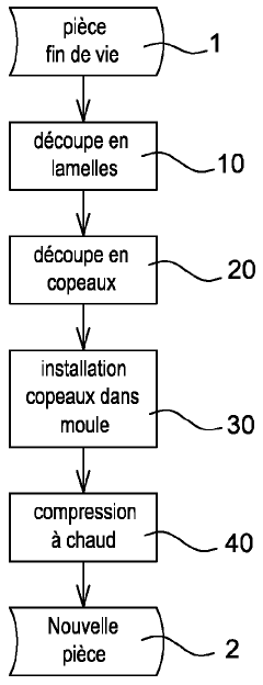 - A process involving cutting composite parts into strips, then into chips of predefined dimensions, which are inserted into a mold and subjected to hot compression to form new parts, allowing for the recycling of all composite material parts and maintaining long fiber lengths for improved mechanical properties.