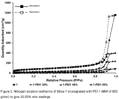 - A sorbent comprising polyalkyleneimine or alkoxylated polyalkyleneimine loaded onto an inorganic solid support with a water content greater than 2 wt%, allowing for aqueous solvent use and reducing the need for organic solvents, which enhances CO2 absorption rates and oxidative stability.