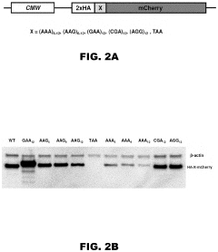 - Incorporation of internal polyA-encoded poly-lysine sequence tags and their variations in open reading frames to modulate protein synthesis by altering the number of consecutive adenine nucleotides in lysine codons, using CRISPR, ZFN, or TALEN systems to introduce synonymous mutations, thereby controlling protein expression levels.