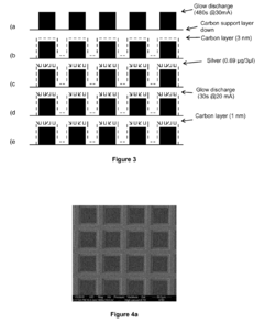 Technical Solution: Corning has developed advanced SERS substrates using proprietary glass-based nanofabrication techniques. Their technology involves precisely engineered metallic nanostructures (primarily silver and gold) deposited on specialized glass surfaces to create highly uniform and reproducible SERS-active sites. Corning's approach focuses on creating optimized "hot spots" through controlled nanogap architectures that significantly enhance electromagnetic fields. Their substrates incorporate both regular array patterns and controlled random distributions to maximize signal enhancement factors, reportedly achieving enhancement factors of 10^6 to 10^8 for various chemical analytes[1]. Corning has particularly focused on developing SERS substrates with extended shelf-life through protective coatings that prevent oxidation while maintaining enhancement properties, addressing a key limitation in commercial SERS applications[3]. Their manufacturing process employs scalable techniques compatible with high-volume production, including advanced lithography and controlled deposition methods.