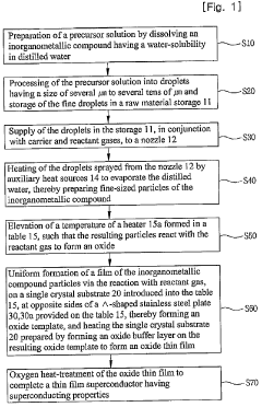 - Thin film deposition of superconductors using spray pyrolysis: Spray pyrolysis can be adapted for the deposition of high-temperature superconductor thin films on various substrates. This approach involves directing the atomized precursor solution onto a heated substrate where chemical reactions occur to form the superconducting film. Parameters such as substrate temperature, solution flow rate, and nozzle-to-substrate distance critically affect film quality. This method offers advantages including relatively low equipment costs, scalability for large-area deposition, and compatibility with complex substrate geometries, making it suitable for manufacturing superconducting devices and components.