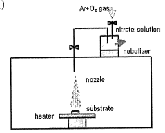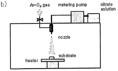 - A method utilizing inexpensive inorganometallic compounds like nitrates, chlorides, and sulfates dissolved in distilled water for spray pyrolysis chemical vapor deposition, forming a precursor solution that is processed into fine droplets, sprayed onto a substrate, and reacted with gases to form a superconducting thin film of REBa2Cu3O7-x with a specific cation ratio, using a Λ shaped stainless steel plate and oxygen heat-treatment to achieve epitaxial deposition.