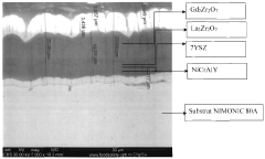 Technical Solution: Praxair has developed an advanced multilayer thermal barrier coating system marketed under their ULTRA series, featuring carefully engineered ceramic layers with controlled porosity and composition gradients. Their technology employs a combination of conventional yttria-stabilized zirconia (YSZ) with advanced ceramic materials such as gadolinium zirconate and ytterbium silicate to create tailored thermal and mechanical properties throughout the coating thickness. Praxair's proprietary deposition processes include both atmospheric plasma spray (APS) and suspension plasma spray (SPS) techniques, allowing precise control over microstructural features ranging from submicron to tens of micrometers. Their multilayer designs incorporate specialized transition layers that mitigate coefficient of thermal expansion mismatches between different ceramic compositions, significantly reducing interfacial stresses during thermal cycling. Praxair's coatings have demonstrated up to 30% lower thermal conductivity compared to standard YSZ coatings while maintaining comparable erosion resistance[4][7].