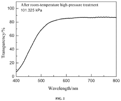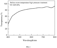 - A method involving room-temperature high-pressure treatment of indium oxide-based TCO materials, specifically titanium-doped indium oxide, which undergoes a structural phase transition from a cubic to a corundum structure, significantly enhancing conductivity and blue light filtering efficiency while maintaining high transparency.