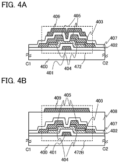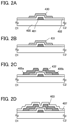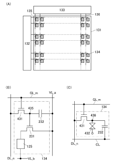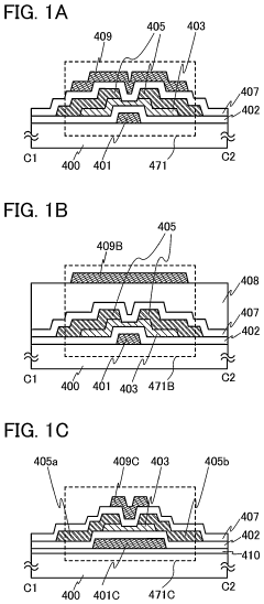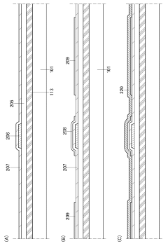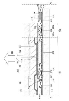 Technical Solution: Semiconductor Energy Laboratory (SEL) has pioneered oxide semiconductor technology for transparent transistors, particularly focusing on IGZO (Indium Gallium Zinc Oxide) thin-film transistors. Their approach involves creating highly uniform amorphous IGZO films with optimized oxygen vacancy concentration to achieve both transparency and high electron mobility (typically 10-15 cm²/Vs)[1]. SEL has developed proprietary deposition techniques that enable low-temperature processing (below 300°C), making their technology compatible with flexible substrates like polyimide films. Their transistors maintain over 80% optical transparency in the visible spectrum while achieving switching speeds sufficient for high-resolution displays[3]. SEL has also addressed stability issues through passivation layers and specialized annealing processes that reduce threshold voltage shifts during prolonged operation. Their technology enables backplane integration in flexible displays with bending radii below 5mm while maintaining electrical performance[5].