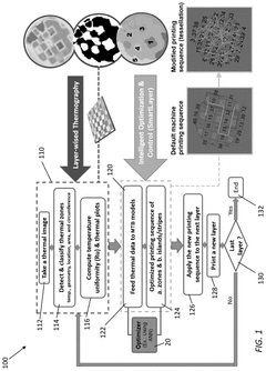 - A method and system that utilize real-time thermographic imaging and mathematical thermophysical-based models to optimize the printing sequence of islands or stripes, ensuring an optimal uniform temperature distribution across each layer, thereby mitigating thermally induced residual stress and thermal distortion.