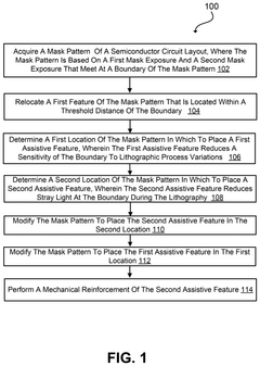 - The method involves determining locations within the mask pattern to place assistive features that reduce sensitivity to lithographic process variations and stray light at the boundary during mask exposures. These assistive features are strategically placed to mitigate the effects of double exposure in the boundary region.