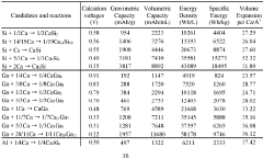 - The use of intermetallic compounds comprising calcium and metals or metalloids such as Sb, As, Cu, Cd, Bi, Ag, Au, Pd, Pt, or Hg as anodes, paired with a calcium salt-based electrolyte and a cathode material like graphite, allowing for reversible decalcination and calcination reactions, and employing high-throughput density functional theory (DFT) calculations to identify suitable anode materials with high energy density and constrained volume expansion.