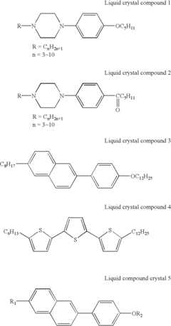 - A smectic liquid crystal device is doped with a Lewis acid compound to suppress ionic electric current and enhance carrier transport, using a hexagonal order structure and tertiary amine molecules to improve carrier injection and mobility, with a protection layer to prevent dopant diffusion.