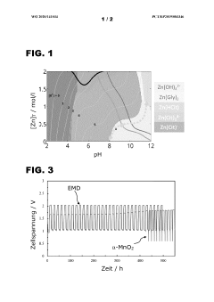 Technical Solution: Toyota Central R&D Labs has developed a proprietary pH buffering technology for aqueous zinc ion batteries focused on automotive applications. Their approach centers on a multi-layer electrolyte system with gradient buffering capabilities that can withstand the demanding charge-discharge cycles required in vehicle applications. The technology employs specially formulated zinc-compatible phosphate and acetate buffer systems that maintain optimal pH ranges (4.0-5.0) even under high current densities experienced during rapid charging and discharging. Toyota's research has shown that controlling the zinc ion activity through precise pH management significantly reduces parasitic side reactions at the electrode-electrolyte interface. Their system incorporates temperature-responsive buffer components that automatically adjust buffering capacity based on operating conditions, addressing one of the key challenges in automotive battery applications where temperature fluctuations are common. Testing has demonstrated that their buffered electrolyte systems can achieve over 2000 stable cycles at 80% depth of discharge, representing a 3-4x improvement over conventional non-buffered aqueous zinc systems.