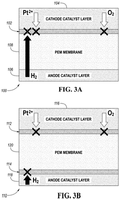 Technical Solution: Ballard Power Systems has developed advanced fuel cell membranes incorporating reduced graphene oxide (rGO) as a functional additive to enhance proton conductivity and mechanical stability. Their proprietary technology involves dispersing precisely controlled amounts of rGO (typically 0.5-2 wt%) within perfluorosulfonic acid (PFSA) polymer matrices. The company's approach focuses on creating a three-dimensional conductive network within the membrane that facilitates proton transport while minimizing electronic conductivity. Ballard's manufacturing process includes specialized surface functionalization of rGO sheets to improve compatibility with the polymer matrix and enhance water retention properties. Their membranes demonstrate approximately 30% higher proton conductivity at low humidity conditions compared to conventional membranes, enabling more stable performance across varying operating conditions. The company has successfully implemented these enhanced membranes in their FCgen®-HPS high-performance stack platform, achieving power densities exceeding 4.3 kW/L and extending operational lifetimes by up to 25% through improved mechanical durability and reduced chemical degradation.