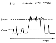 Schmitt triggers are electronic circuits with hysteresis that convert analog input signals to digital output signals. The basic design includes a comparator with positive feedback to establish two different threshold voltages, creating hysteresis that prevents oscillation when the input signal contains noise. This fundamental circuit provides clean switching and noise immunity in digital systems by maintaining its output state until the input passes the opposite threshold level.- Basic Schmitt Trigger Circuit Design: Schmitt triggers are electronic circuits with hysteresis that convert analog input signals to digital output signals. The basic design includes a comparator with positive feedback to establish two different threshold voltages, creating hysteresis that prevents output oscillation when the input signal contains noise. This fundamental circuit provides clean switching between binary states and is widely used in signal conditioning applications.
