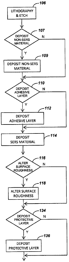 Various fabrication methods can be employed to create effective SERS substrates for photovoltaic applications. These include lithographic techniques, chemical synthesis, self-assembly, template-assisted growth, and physical vapor deposition. Each method offers different advantages in terms of cost, scalability, reproducibility, and control over the nanostructure geometry. Advanced fabrication approaches enable the creation of hierarchical structures that can simultaneously enhance light trapping and charge collection, leading to significant improvements in photovoltaic efficiency.Expand Specific Solutions05 Integration of SERS substrates with different photovoltaic technologies