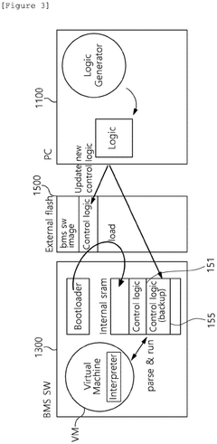 Technical Solution: Samsung SDI has implemented a sophisticated BMS with remote software update functionality. Their system employs a multi-layered approach to battery management, incorporating both cell-level and pack-level monitoring[4]. The BMS uses advanced algorithms to balance cells, manage thermal conditions, and optimize charging/discharging cycles. Software updates allow for the implementation of new safety features, improved energy efficiency algorithms, and enhanced diagnostic capabilities[5]. Samsung's BMS also includes a unique "self-learning" feature that adapts to individual usage patterns over time, further optimizing battery performance and lifespan[6].
