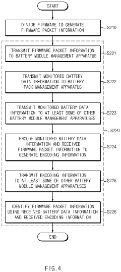 - The battery pack management apparatus divides the firmware into packet information and transmits it to battery module management apparatuses, which monitor battery data and transmit it back, also encoding and relaying this information to ensure complete data collection and communication, even in areas with poor connectivity.