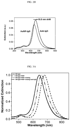 Advanced plasmonic biosensors incorporate temperature compensation mechanisms to maintain accuracy despite thermal variations. These mechanisms include reference channels, differential sensing approaches, and integrated temperature sensors that allow for real-time calibration. Some designs utilize materials with complementary thermal responses or algorithmic corrections to offset temperature-induced shifts in plasmonic resonance, ensuring reliable biosensing results across varying environmental conditions.Expand Specific Solutions04 Thermally stable biomolecular recognition elements