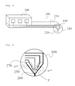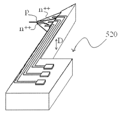 - A method involving the sequential formation of multi-layer insulating layers, ion implantation for source/drain formation, photolithography for probe and channel creation, and selective wet etching to achieve precise control over channel dimensions, using a low-cost photolithography device to form AFM cantilevers with FETs, allowing for various channel shapes and accurate channel length control.
