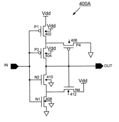 CMOS technology is widely used to implement Schmitt trigger circuits due to its low power consumption and high noise immunity. These implementations typically use complementary PMOS and NMOS transistors to create the hysteresis effect. Various CMOS configurations can be designed to optimize parameters such as switching thresholds, propagation delay, and power consumption, making them suitable for different applications in digital systems.Expand Specific Solutions03 Low-Power Schmitt Trigger Designs
