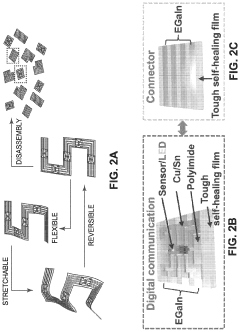 - Development of self-healing elastomer-based modular electronics using flexible and stretchable polymer films with conductive materials, allowing for the formation of tunable electronic circuits and connectors that can reconnect without external force, even in the presence of liquids, enabling flexible and durable wearable devices.