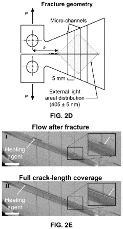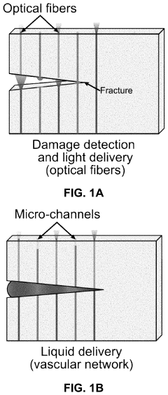 - A microvascular-based self-healing system incorporating one-part, photo-reactive chemistry with embedded optical fibers or polymer waveguides for rapid, light-activated repair, utilizing internal micro-channels for fracture-induced liquid healing agent transport to the damage zone, enabling in situ self-healing of Mode-I fractures via visible light polymerization.