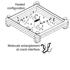 - A polymeric composition utilizing strain-hardened shape memory polymer fibers that narrow cracks through tension programming and embedded thermoplastic particles that melt and diffuse into the polymer matrix to heal cracks at the molecular scale, mimicking the biological healing process of human skin, without the need for external confinement.