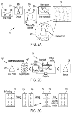 Strengths: Exceptional thermal cycling resistance with demonstrated stability across wide temperature ranges; healing efficiency maintained after multiple repair cycles; integration with existing AM processes without significant modifications. Weaknesses: Higher initial material costs compared to conventional polymers; healing capacity diminishes after multiple major damage events; limited self-healing capability for very large structural damages.
