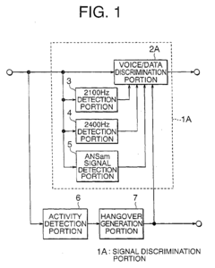 - The signal discrimination apparatus includes specific detection means for identifying tone signals and start-up procedure signals, such as the ANSam signal, to differentiate between voice and data signals, preventing misclassification by setting a detection flag when specific signals are detected during the start-up procedure of the V.34 modem signal.