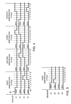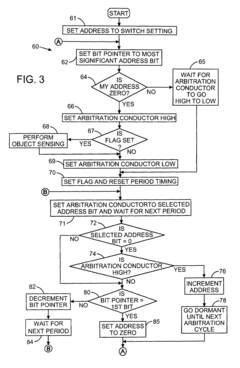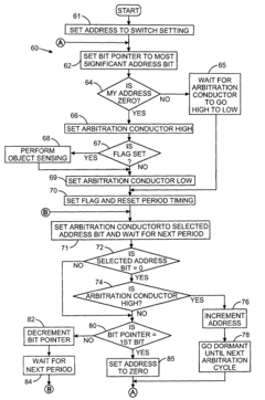- A method where each proximity sensor is assigned a unique binary address, and through an arbitration process, only one sensor is allowed to perform object detection at a time by applying specific logic levels to a communication link, preventing interference by suspending participation of other sensors.