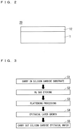 - Epitaxial growth techniques: Epitaxial layer growth on silicon carbide substrates is critical for device performance. Advanced epitaxial techniques like chemical vapor deposition (CVD) are used to grow high-quality, uniform epitaxial layers with controlled thickness and doping profiles. The quality of these epitaxial layers directly impacts device characteristics such as breakdown voltage, on-resistance, and switching speed. Innovations in epitaxial growth processes focus on reducing defects, improving uniformity, and enhancing the interface between the substrate and epitaxial layers.