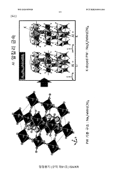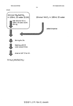 - Incorporating potassium ions with a large ionic radius into the Prussian White structure to prevent water trapping, using a method involving the addition of potassium chloride and manganese chloride solutions to form a compound like Na2-xKxMn[Fe(CN)6, which is then mixed with conductive materials and binders for electrode manufacturing.