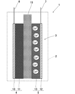Solid-state electrolytes for calcium ion batteries offer advantages in terms of safety and stability. These materials include ceramic, glass-ceramic, and polymer-based conductors specifically designed for calcium ion transport. The solid-state conductors often feature specialized crystal structures with calcium ion migration pathways. Research focuses on achieving high ionic conductivity at room temperature while maintaining mechanical stability and good interfacial contact with electrodes.Expand Specific Solutions04 Interface engineering for enhanced calcium ion transport