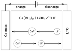 Various electrolyte compositions can be used to enhance the conductivity of calcium ion batteries. These include specific salts, solvents, and additives that improve calcium ion transport. The electrolyte formulations are designed to minimize side reactions with electrode materials while maximizing ionic conductivity. Some compositions incorporate fluorinated compounds or ether-based solvents to achieve stable calcium ion conduction at room temperature.- Electrolyte compositions for calcium ion batteries: Various electrolyte compositions can enhance the conductivity of calcium ion batteries. These include specific salts, solvents, and additives that improve calcium ion transport. Optimized electrolyte formulations can reduce interfacial resistance, enhance ion mobility, and improve overall battery performance. The selection of appropriate electrolyte components is crucial for achieving high ionic conductivity in calcium-based battery systems.