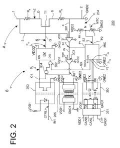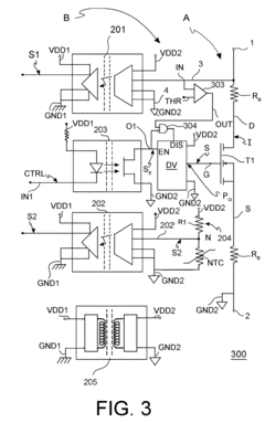 Specialized semiconductor device structures are developed for high-current solid-state relay applications. These include optimized MOSFET and IGBT designs with increased active areas, trench gate structures, and improved doping profiles. Multi-chip modules and advanced packaging techniques allow for higher current densities while maintaining isolation requirements. Some designs incorporate novel semiconductor materials like silicon carbide or gallium nitride that offer superior current handling capabilities compared to traditional silicon-based devices.Expand Specific Solutions05 Control and driving circuits for high-current solid-state relays
