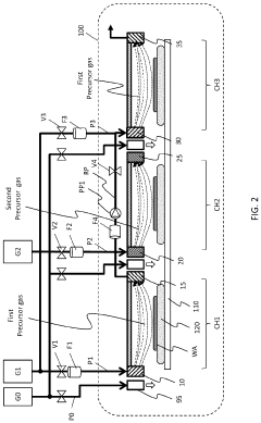 Advanced precursor delivery systems enhance spatial ALD throughput through optimized gas flow dynamics, rapid precursor switching, and efficient utilization of precursor materials. These systems employ specialized nozzle designs, pulsed delivery mechanisms, and precise flow control to ensure uniform precursor distribution while minimizing waste. Improved precursor delivery enables faster deposition rates and better film quality in high-volume manufacturing environments.Expand Specific Solutions05 Integration of spatial ALD with in-line processing systems