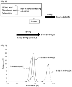 - A method involving mixing raw materials containing lithium, phosphorus, and sulfur with a solvent to form a solution, followed by spray drying at a pressure of 0.01 MPa or more, which allows for the production of solid electrolytes with a sharp particle size distribution and small median diameter, eliminating the need for crushing devices and simplifying the process.