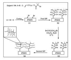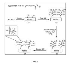 - A relayed surface-initiated polymerization (SIP) strategy with ultra-low initiator density and the use of a hydrophobic monomer to create a multi-layered polymer structure on a polymer substrate, specifically incorporating a first linker at a controlled surface density and subsequent polymer layers to achieve a contact angle of at least 150 degrees.