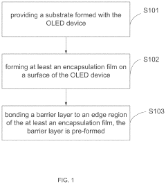 - Edge sealing methods for flexible OLED encapsulation: Edge sealing methods are critical for preventing lateral diffusion of moisture and oxygen into flexible OLED devices. These techniques involve applying specialized sealants or barrier structures around the perimeter of the display to create a complete encapsulation system. Advanced edge sealing approaches include laser sealing, UV-curable adhesives, and hybrid organic-inorganic materials that maintain flexibility while providing excellent barrier properties at the vulnerable edges of the device.